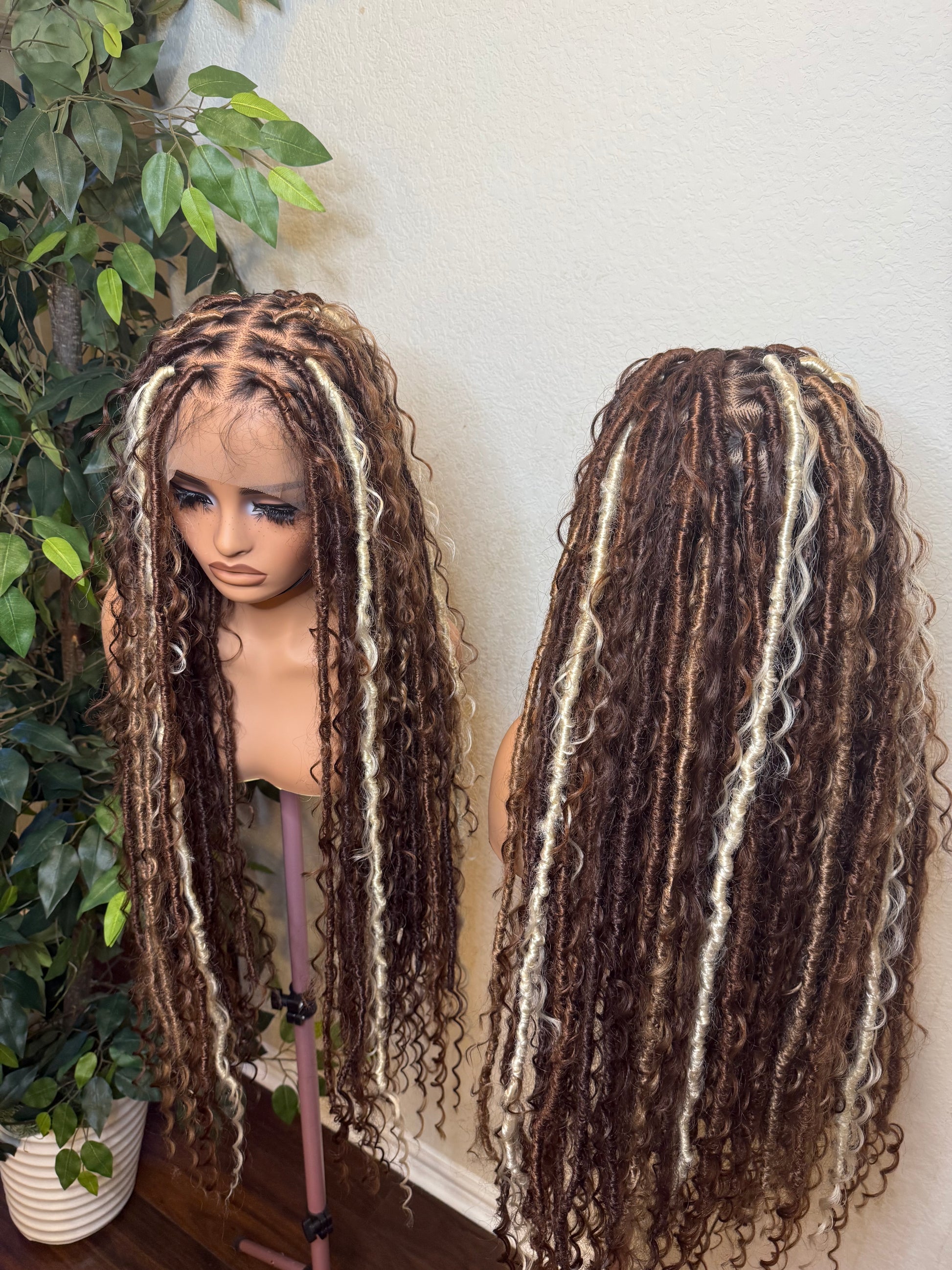 Full lace Faux locs made with fiber lace with synthetic boho braids in 32 inches. Medium: Cap size :21.5 – 22.5”